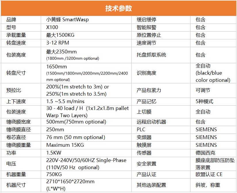 小黄蜂X100全自动智能缠绕机可自动切膜、夹膜,无需再使用手或工具进行断膜或将膜放在托盘上,大大提高工作效率。